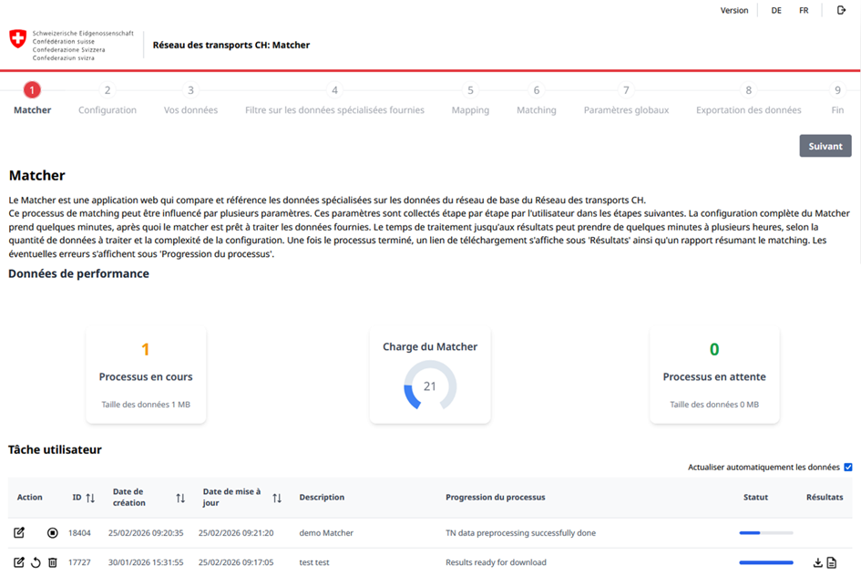 Interface de gestion permettant de piloter les processus de « matching ». L'utilisateur suit en temps réel l'avancement des tâches, consulte les données de performance et accède directement aux résultats.