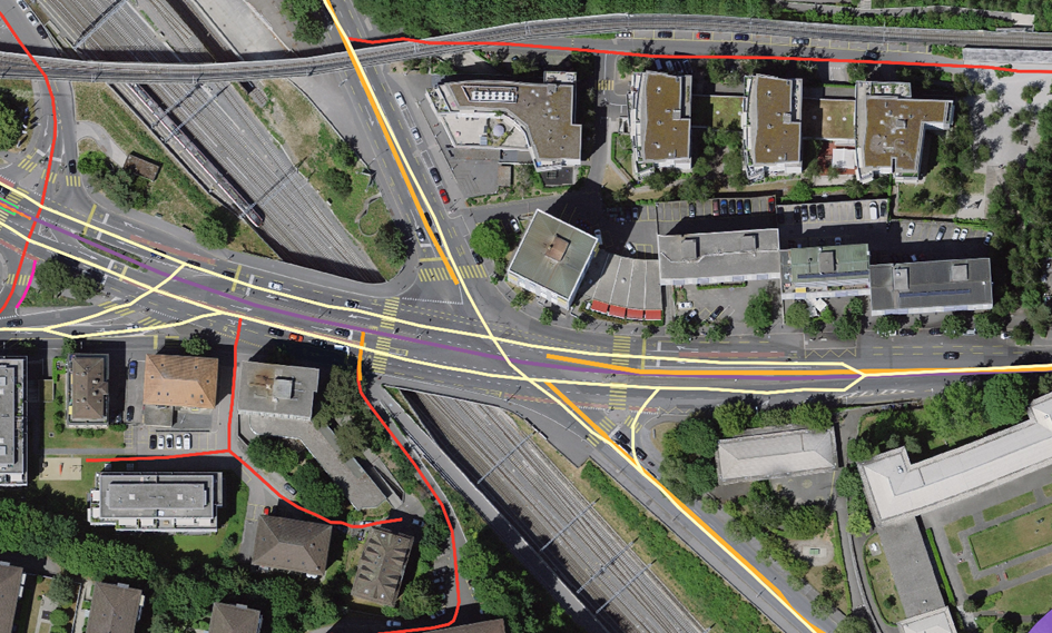 Résultat final après l’utilisation du Matcher. Les réseaux disparates sont agrégés sur le réseau de base swissTNE. Ces géométries portent alors l'ensemble des attributs métiers nécessaires aux modélisations de la propagation du bruit.
