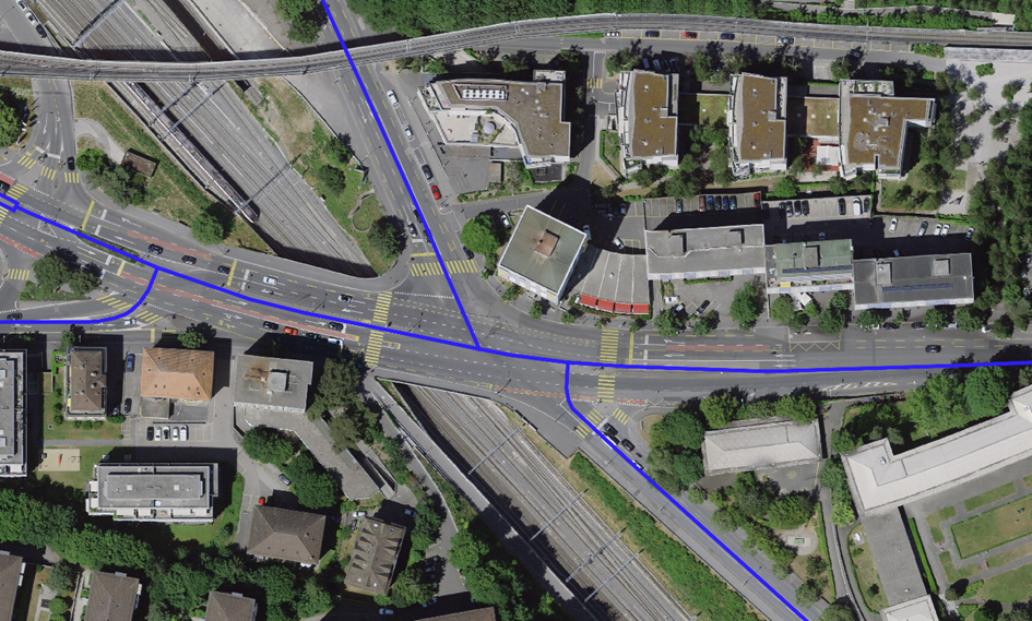 Comme l'illustrent les deux figures ci-dessous, le processus transforme une réalité fragmentée en un référentiel unique. La première expose la superposition complexe des réseaux métiers, où chaque source possède sa propre topologie. La seconde représente l'aboutissement de cette démarche : l'ensemble des segments hétérogènes a été recalé et fusionné sur le réseau de base de swisstopo. Ce visuel (en bleu) constitue désormais le résultat final de la combinaison. Il allie unicité et richesse des données métiers, permettant de calculer les émissions de bruit de manière homogène sur chaque segment. Ce flux de traitement, automatisé par le Matcher et les scripts FME livrés au client, garantit une mise à jour pérenne du cadastre cantonal.