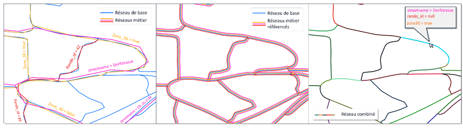 Son champ d’action est varié et permet aussi de valoriser ses données : comme transférer des attributs d’un réseau métier à un autre ou migrer des données vers un autre réseau en utilisant le réseau de base. Le fait d’être référencé sur le réseau de base de swisstopo donne la possibilité de bénéficier directement de ses mises à jour, qu’il s’agisse d’ajouts, de suppressions ou de modifications d’infrastructures.