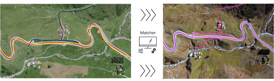 Le réseau de base de swisstopo (swissTNE Base), créé en 2023 et actualisé régulièrement, couvre l’entier du territoire avec tous les modes de transports possibles : les voies ferrées, les routes, les chemins, les transports à câble et les voies de navigation. Ils sont tous connectés pour créer un réseau national multimodal. L’outil Matcher, qui prend la forme d’une application web, sert de passerelle entre ce réseau national et les données métier du client. De nouvelles possibilités s’offrent alors au gestionnaire des données comme l’unification automatisée de différentes données spatiales ou la possibilité de combiner des réseaux distincts représentant une même réalité. De plus, il permet également de migrer d’un réseau à un autre ou d’unifier l’ensemble sur le référentiel national de swisstopo. Ces transformations garantissent ainsi l’interopérabilité, la cohérence géométrique et la continuité topologique de vos données.
