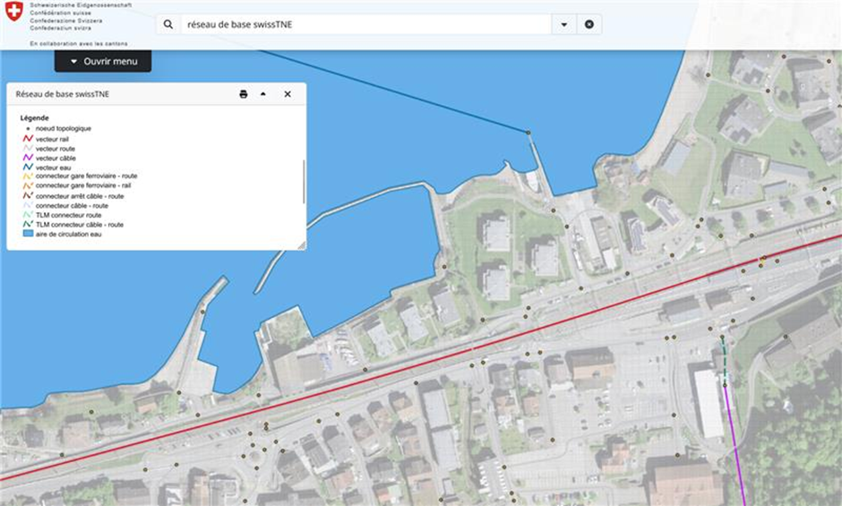 Visualisation du réseau de base de transport national (swissTNE Base) sur le portail fédéral. Ce réseau sert de colonne vertébrale géométrique pour tous les processus de référencement effectués par le Matcher.
